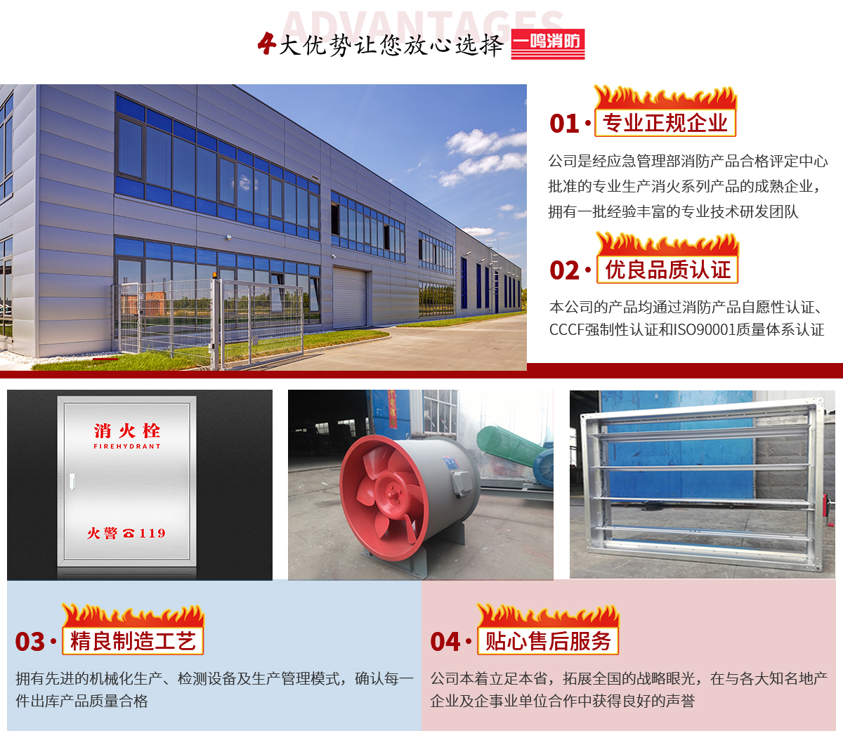 合肥一鳴消防設備有限公司是經應急管理部消防產品合格評定中心批準的專業生產消火栓箱系列、消防風機系列、防火閥排煙閥系列、風管系列、不銹鋼消防箱及配電箱柜系列等產品的成熟企業,本公司的產品均通過消防產品自愿性認證、CCCF強制性認證和ISO90...